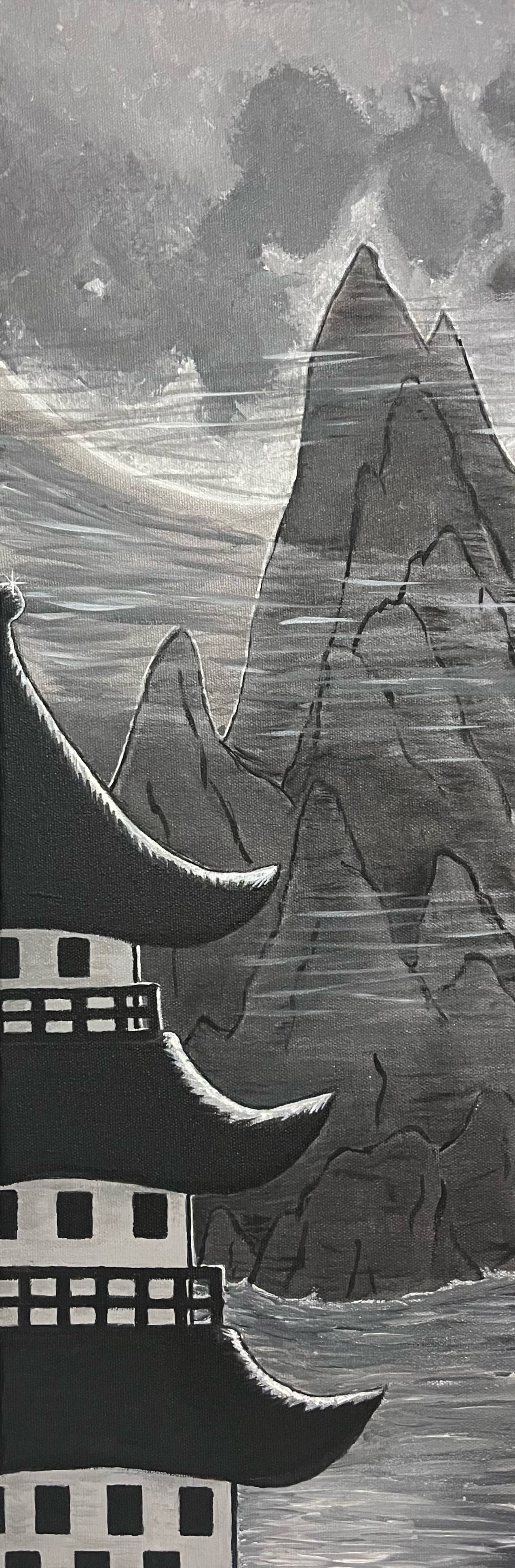 Bathed in silvery tones, this tranquil scene evokes the quiet mystery of night. A tiered pagoda rises in the foreground, its curved eaves catching the glow of moonlight, while mist drifts across dark waters. Beyond, jagged mountains loom like ancient guardians, their peaks softened by the haze. The monochromatic palette enhances the atmosphere, creating a sense of timeless serenity and reverence for nature’s grandeur. In the Moonlight captures a fleeting stillness — a moment suspended between shadow and light, silence and presence.